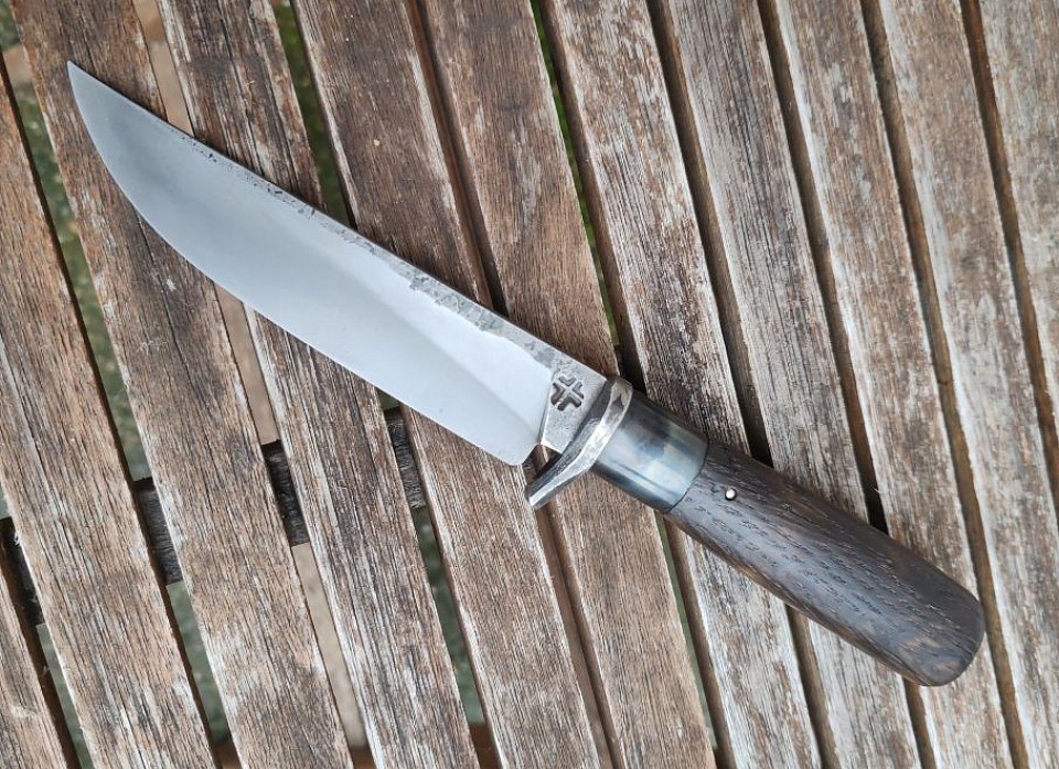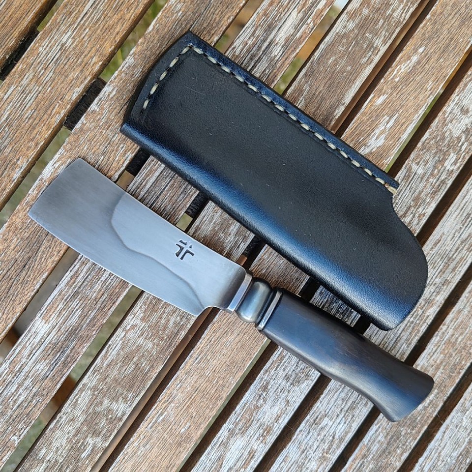 Semi intégral en acier forgé C70e2u, lame de 7.5cm , manche ébène, longueur 17cm , étui cuir .