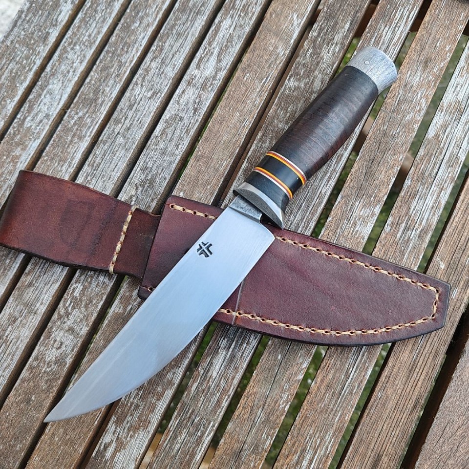 Lame forgée en 80crv2 de 10.3cm , manche cuir et chevreuil, longueur 21cm , étui cuir.