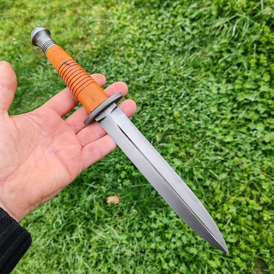 Lame forgée en 80crv2 de 10.5cm , manche laiton, cuir et chevreuil, longueur 21.5cm , étui cuir .